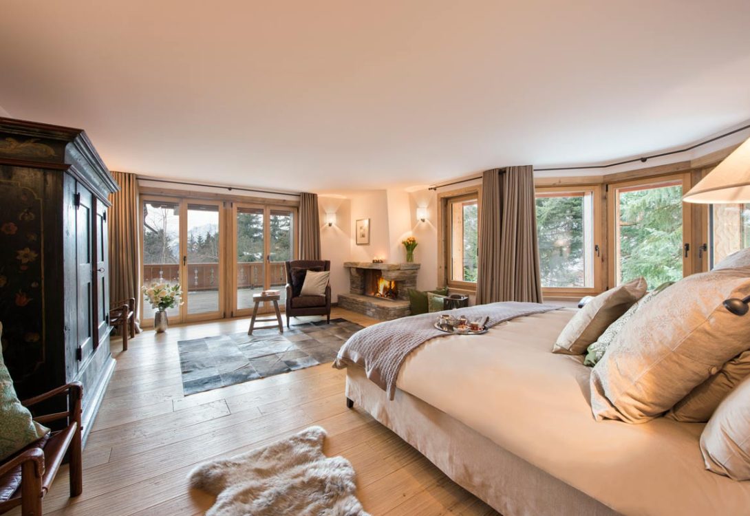 The master suite is a highlight, with a decorative fireplace, fur accents, French windows, and a luxurious en-suite featuring a freestanding bathtub, double sinks, and separate shower. Additional twin, double, and bunk rooms provide flexibility for families and groups.