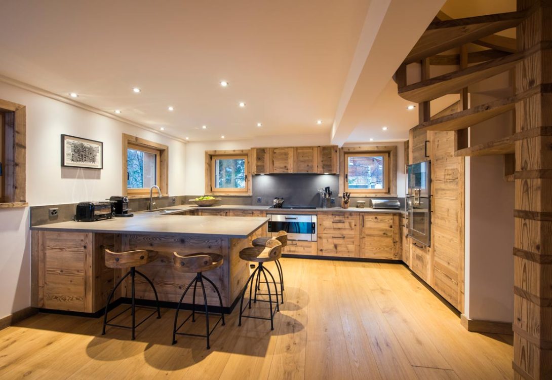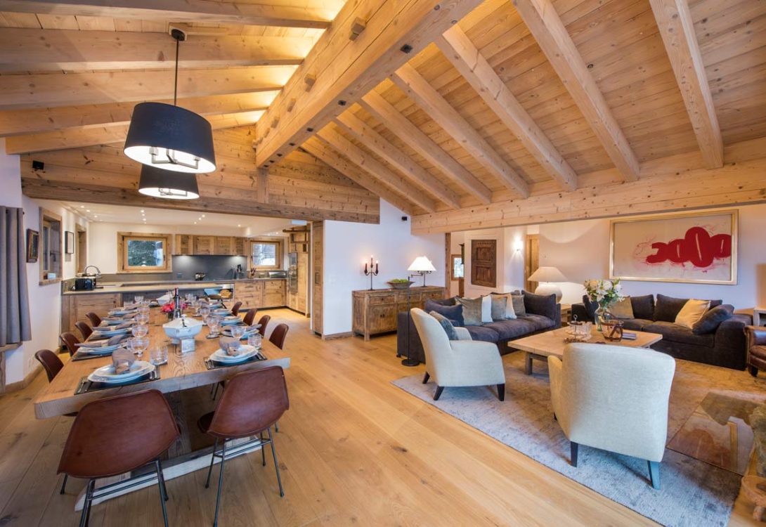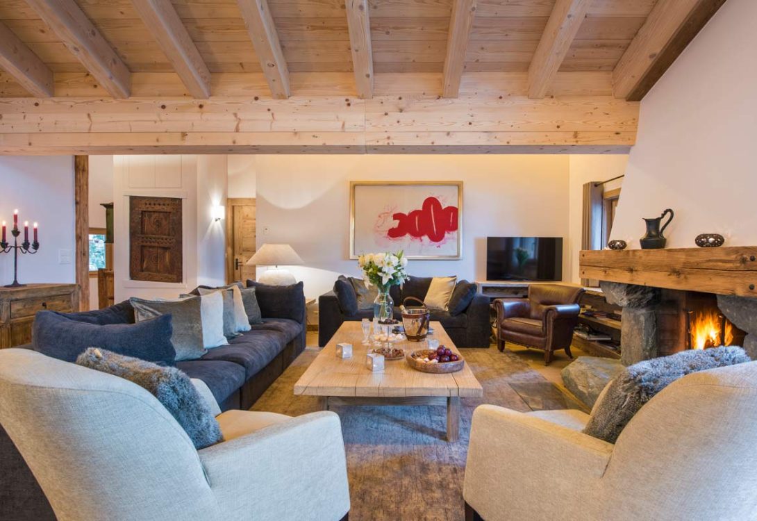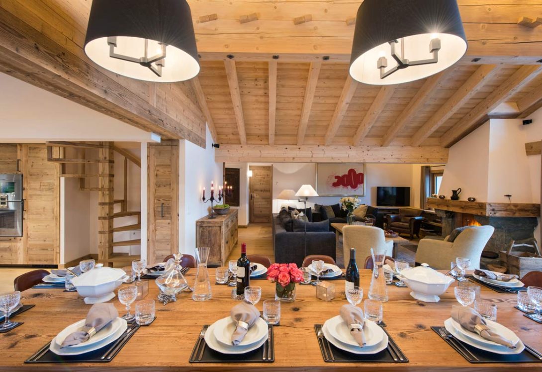 The heart of the chalet is its sophisticated living and dining area, complete with sliding glass doors that open to the terrace, a central fireplace, and a professionally equipped kitchen. A mezzanine level adds an additional en-suite bedroom.